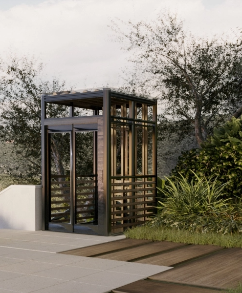 Each villa has a plot of 2,300m2 that cascades down to thelevel of the garage entry, a plateau for relaxation with an open fireplacein the olive grovein the center part of the plot, and a modern villa with a pool area on the tallest cascade. Stairs or a panoramic elevator can take you to the house and poollevel.