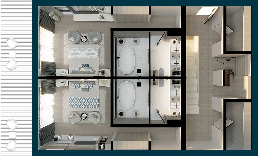 A separate shower area createsintimacy, while a vast bathtub createsluxury and relaxation. The bathtub has a view of the bedroom, which adds a sense ofluxury to your relaxing moments.These master bathrooms are ideal for unwinding and escaping the stresses of everyday life.