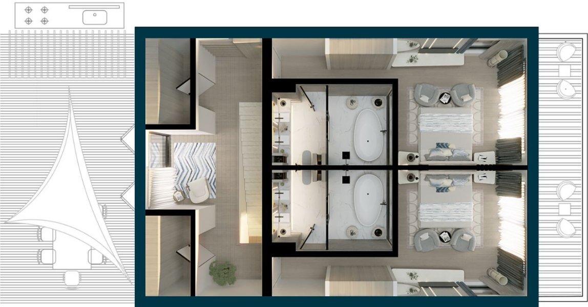 Villas' master bedrooms are a natural sanctuary of luxury and relaxation. Each has been meticulously planned to provide you with the best possible stay experience. These spacious and bright rooms are bathed with natural light, creating a warm and peaceful atmosphere, and the ambient lighting helps you unwind after the day's activities in the evening